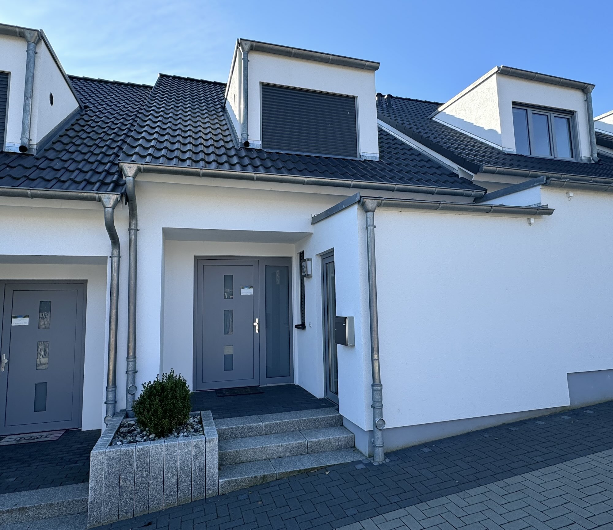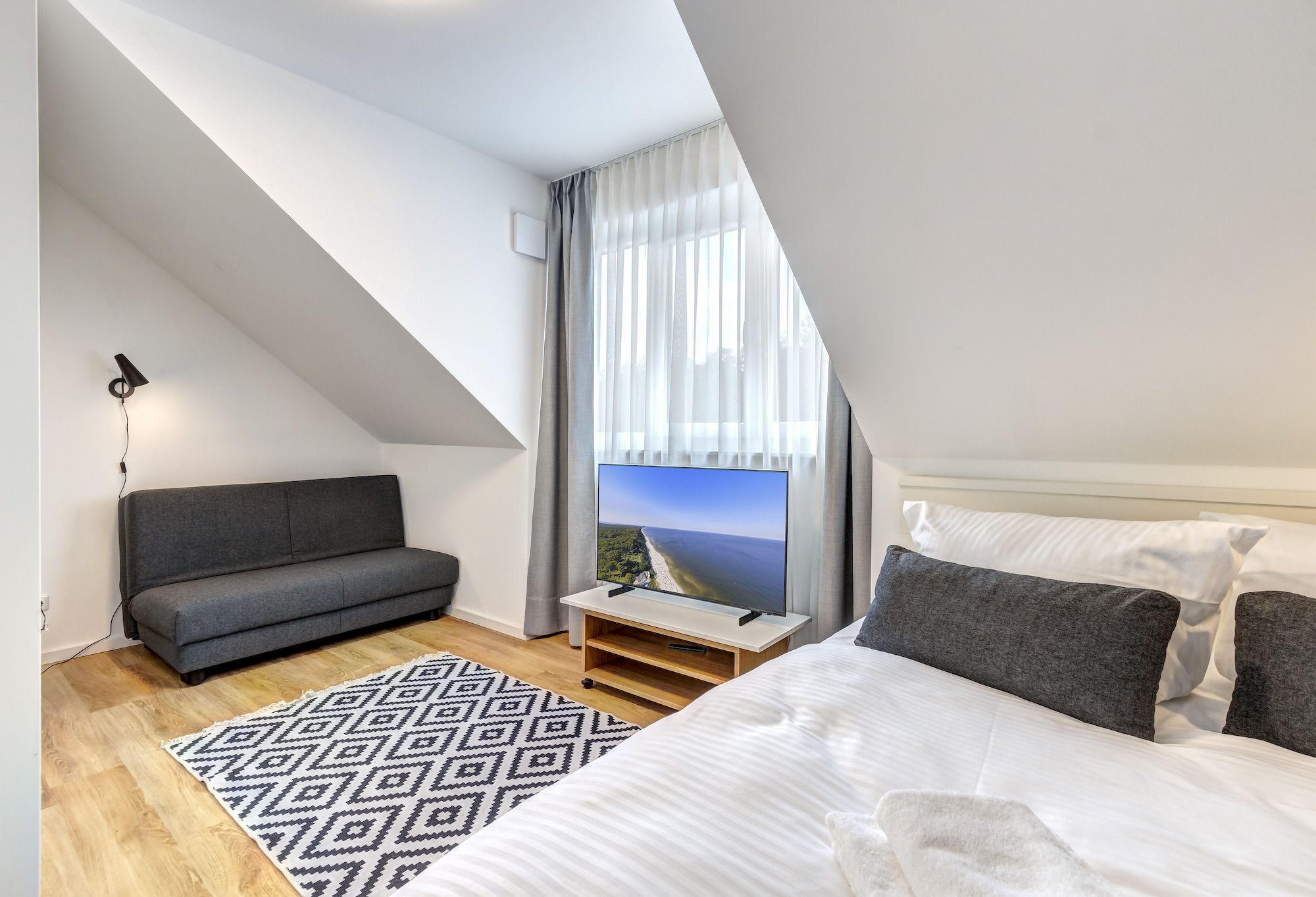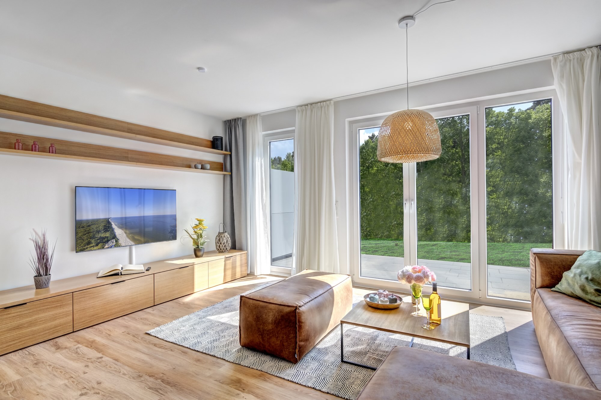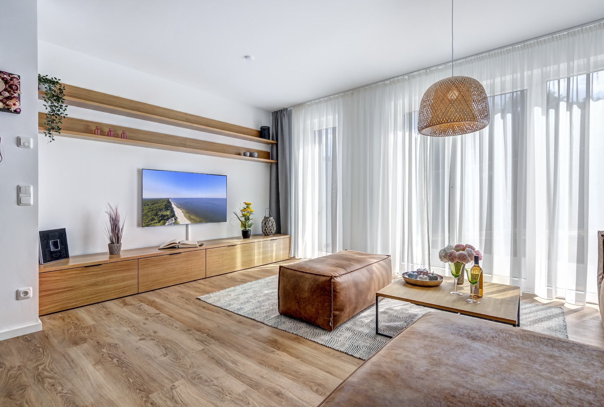 Helles geräumiges Wohnzimmer mit Ledersofa und TV