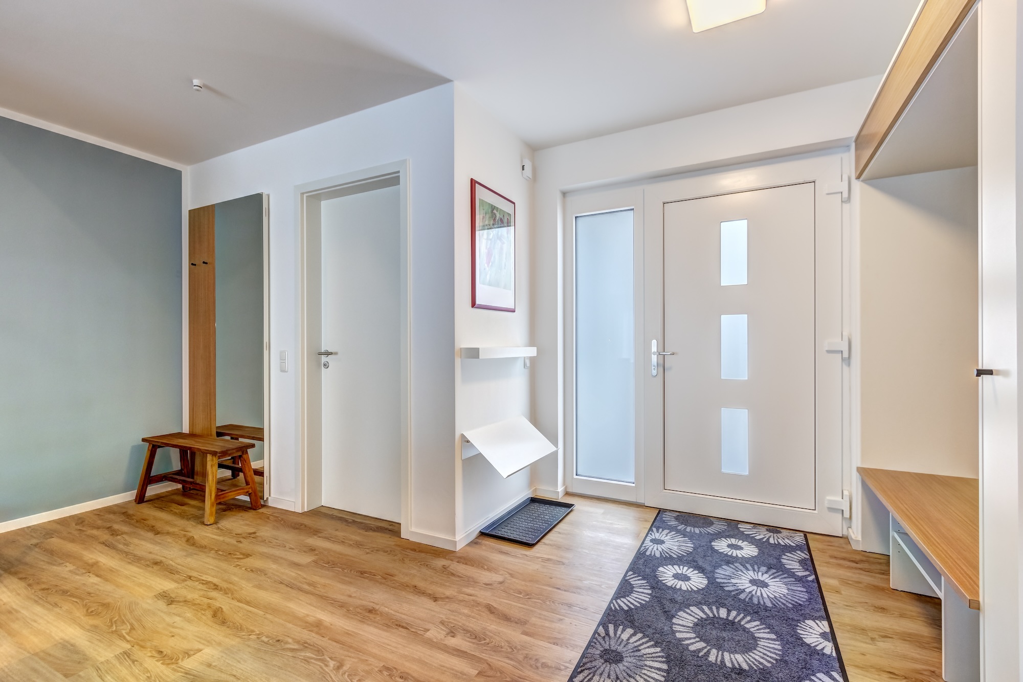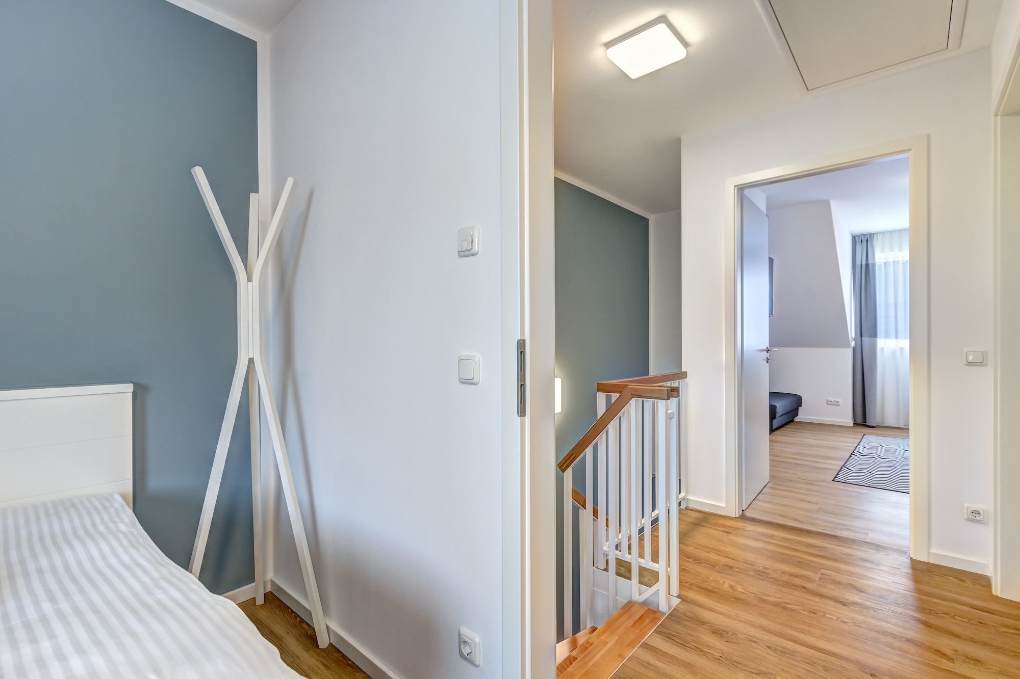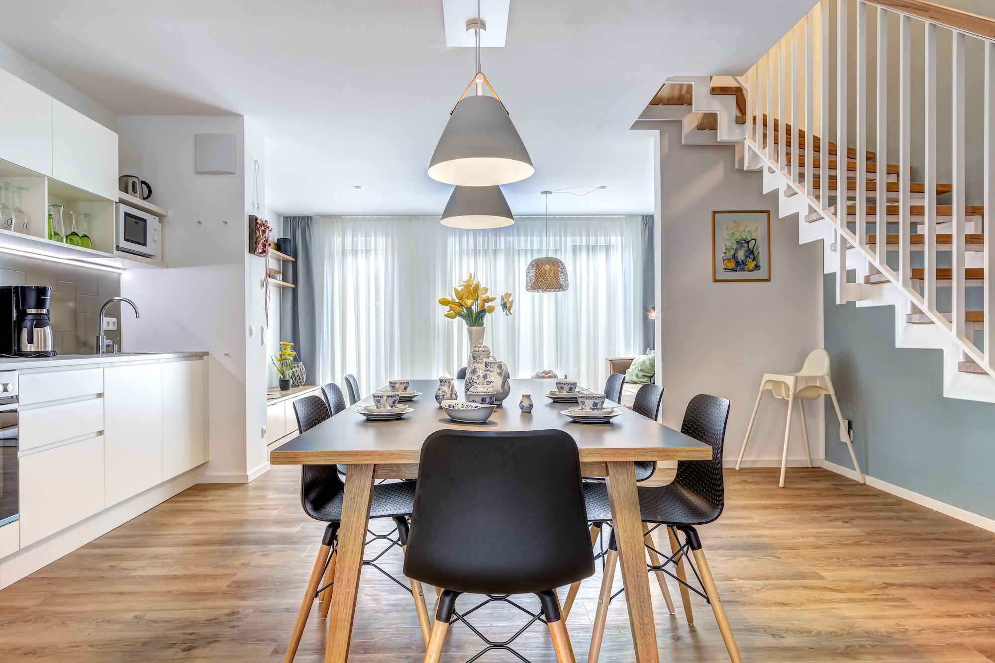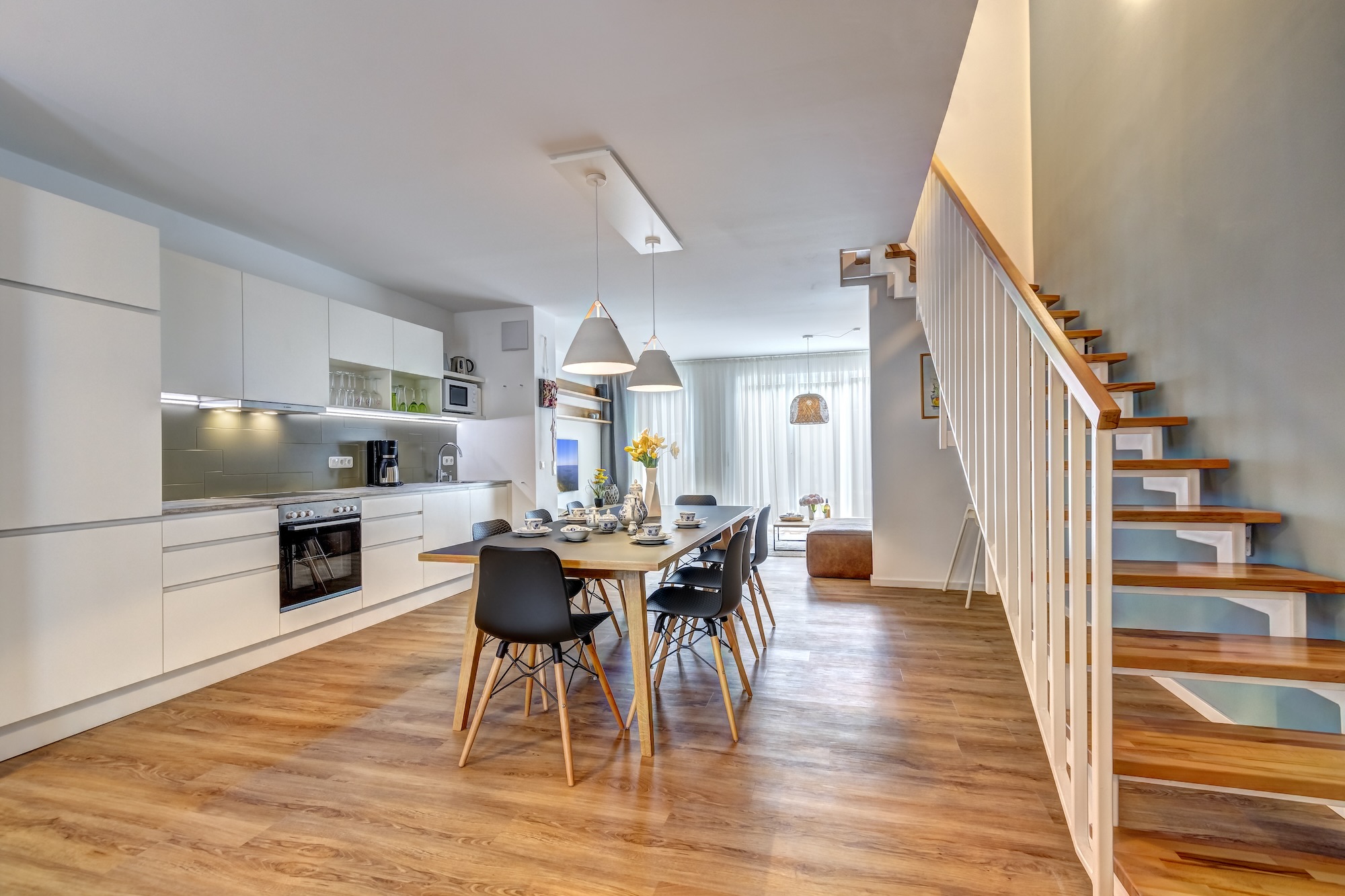 Esstisch mit Blick auf Treppe ins Obergeschoss